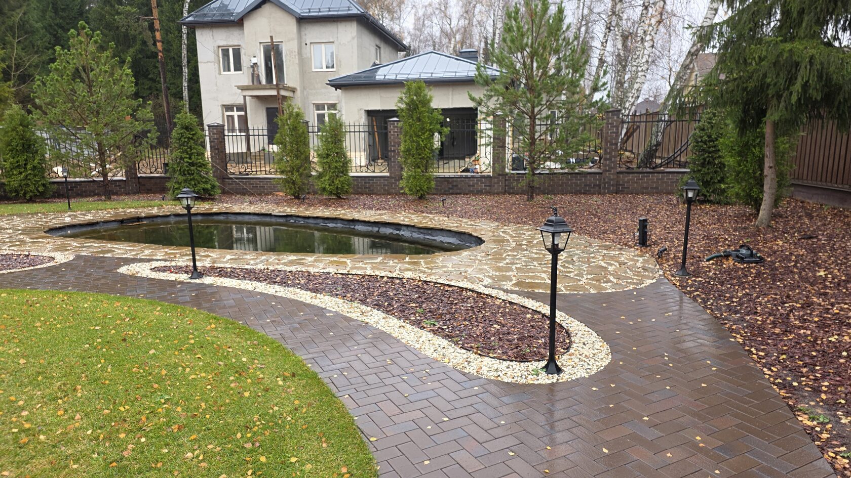 Вариант 3: Премиум (бюджет ~500 000+ руб.) • Профессиональное освещение всего участка. • Подсветка 5-7 деревьев и архитектурных элементов. • Освещение водоёма. • Гирлянды, декоративные светильники. • Умная система управления (включение по расписанию, регулировка яркости).